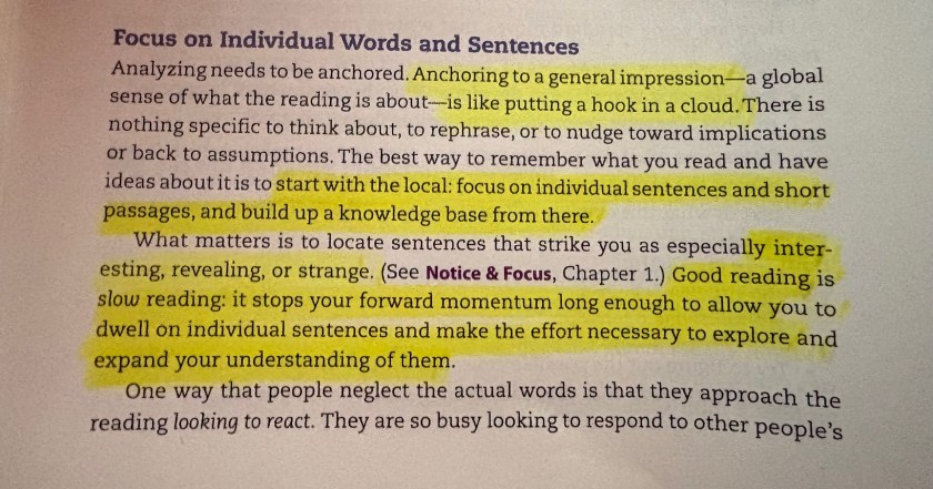 In Writing Analytically, David Rosenwasser and Jill Stephen recommend “focus[ing] on individual sentences and short passages and build[ing] up a knowledge base from there” (48). The paragraphs that follow demonstrate how developing your understanding of a text through your close examination of individual words enables you to develop an analysis of it.