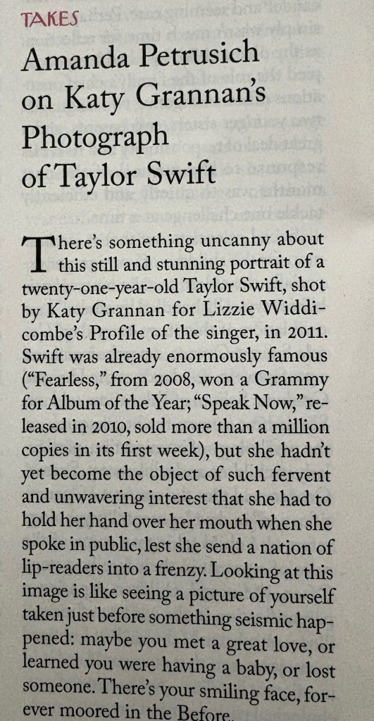 Petrusich, Amanda. “Amanda Petrusich on Katy Grannan’s Photograph of Taylor Swift.” The New Yorker, 12 Jan. 2026, pp. 44.