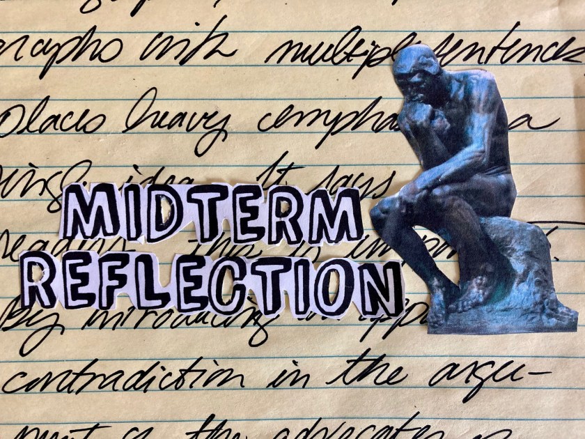 In class this morning we returned to the sample student reflections that we examined before spring break, and we also read and discussed the model midterm reflection that I wrote for my students last fall. The revision of that reflection, which I published on my blog in October, appears below.