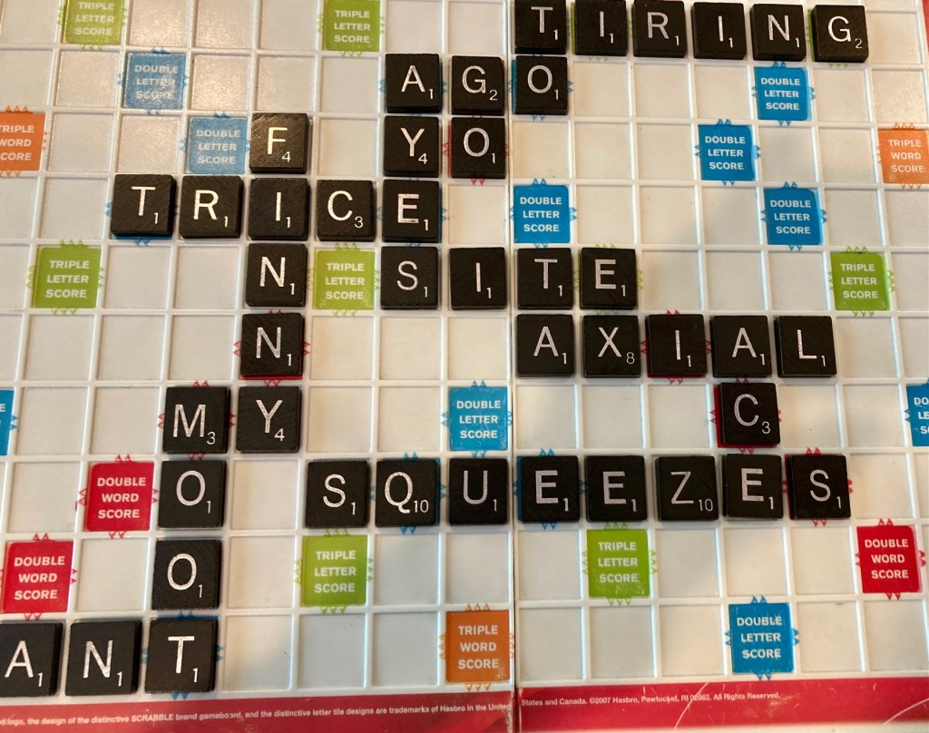 Scrabble invloves a combination of luck and skill, and luck was clearly on my side yesterday morning when I was able to Scrabble, or Bingo (for an additional fifty points), by playing all seven of my tiles. Using the e in ace as a bridge, I was able to play squeezes with the q on a double letter score, the first e on a double letter score, and the final letter, s, on a double word score for a total of 124 points.