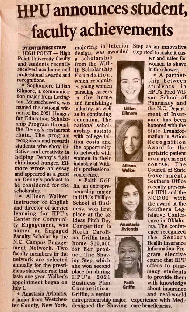 Lillian Ellmore, who was an English 1103 student of mine last spring, has been named the national winner of the 2021 Hungry for Education scholarship program sponsored by the restaurant Denny’s. In an article about Ellmore’s achievement, The High Point Enterprise staff reported that Hungry for Education “recognizes and rewards students who show initiative and creativity in helping Denny’s fight childhood hunger.”