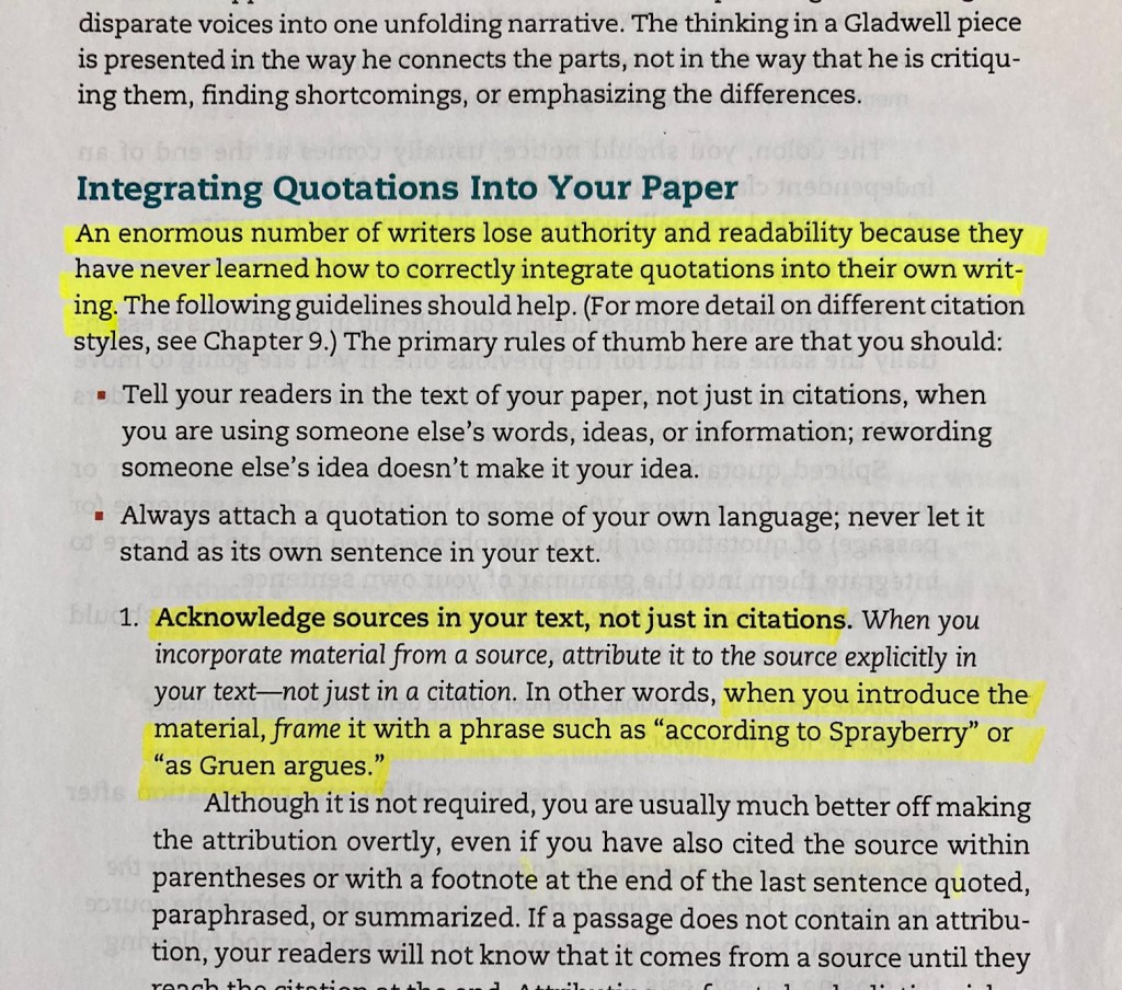 In “Integrating Quotations Into Your Paper,” the most helpful section of the textbook, the authors note that “[a]n enormous amount of writers lose authority and readability because they have never learned how to correctly integrate quotations into their own writing” (Rosenwasser and Stephen 231).