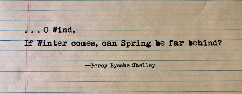 The words of the epitaph above conclude Percy Bysshe Shelley’s poem “Ode to the West Wind,” published in 1820. In that poem, the speaker meditates on the seemingly contradictory nature of the wind as both “[d]estroyer and preserver” (line 14). The poem ends on a positive note with the promise of spring, which will not arrive until March 20. That is why the word spring is enclosed in quotation marks in the title of this post. It isn’t spring yet, but it isn’t “far behind” (line 70), and its nearness brings us hope.