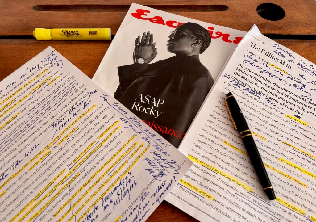 My annotated copy of Tom Junod’s “The Falling Man,” along with March issue of Esquire, which features Tom Hendrickson’s article on Tom Junod
