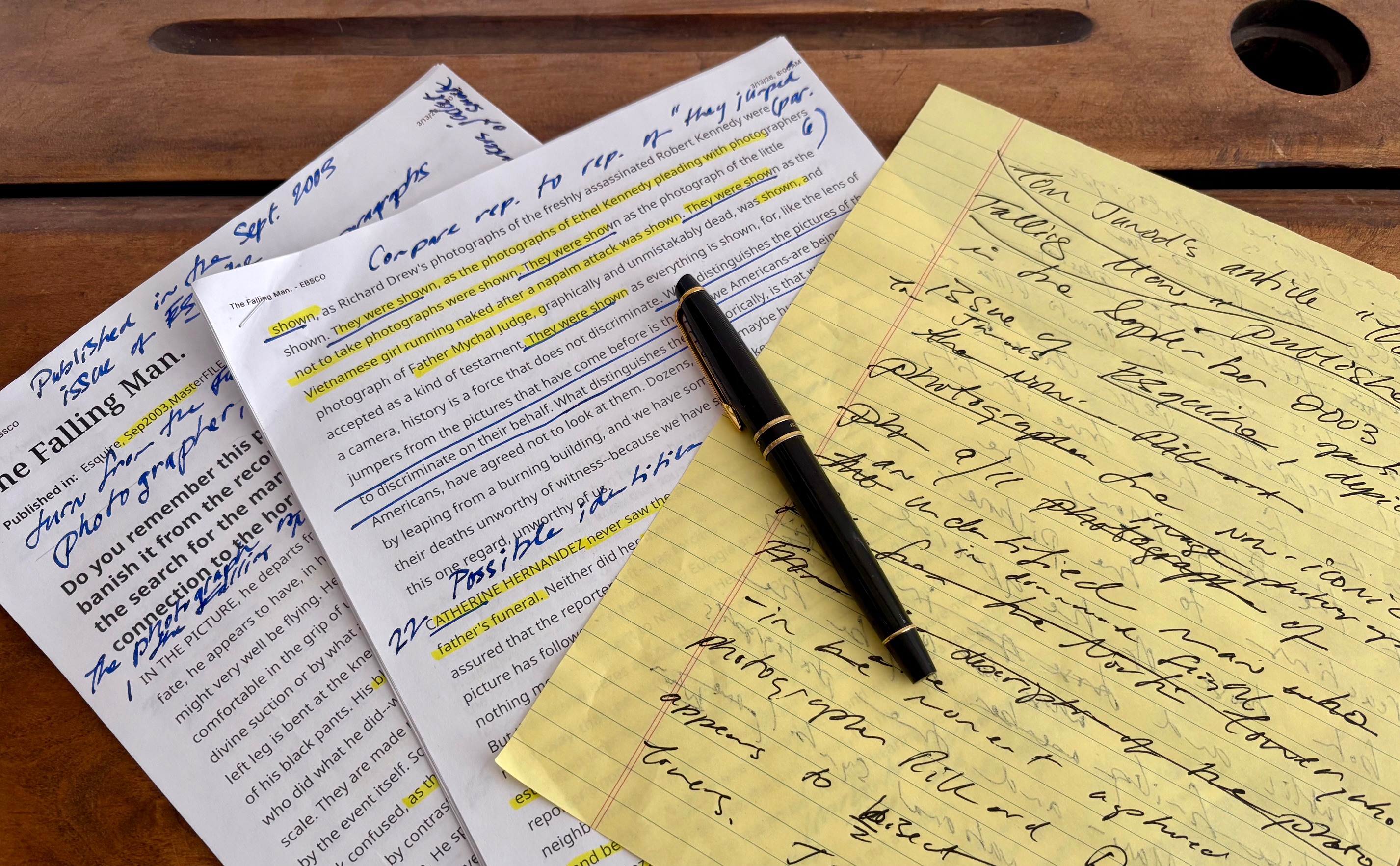 My annotated copy of Tom Junod’s “The Falling Man” and the first page of the draft of my bibliographic entry