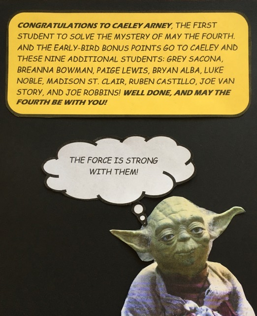 Congratulations to Caeley Arney, the first student to solve the mystery of May the fourth.