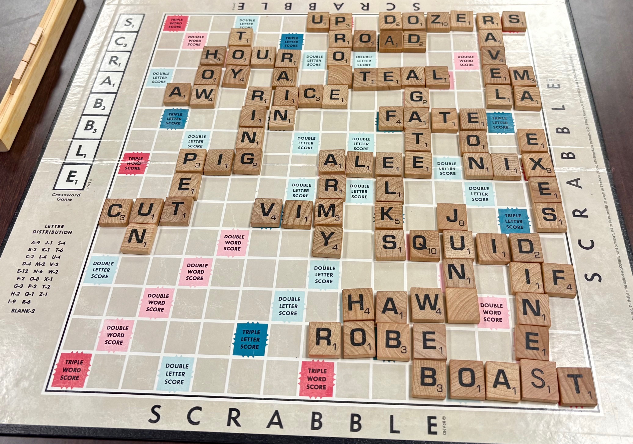 Because they knew that da (a father) and od (a hypothetical force) were playable words, the members of one of last Friday’s teams played dozers (ones who doze) in the upper right corner for a triple-word score. Because the z was played on the double-letter square, the team earned a total of eighty-four points for dozers (seventy-eight), da (three), and od (three).