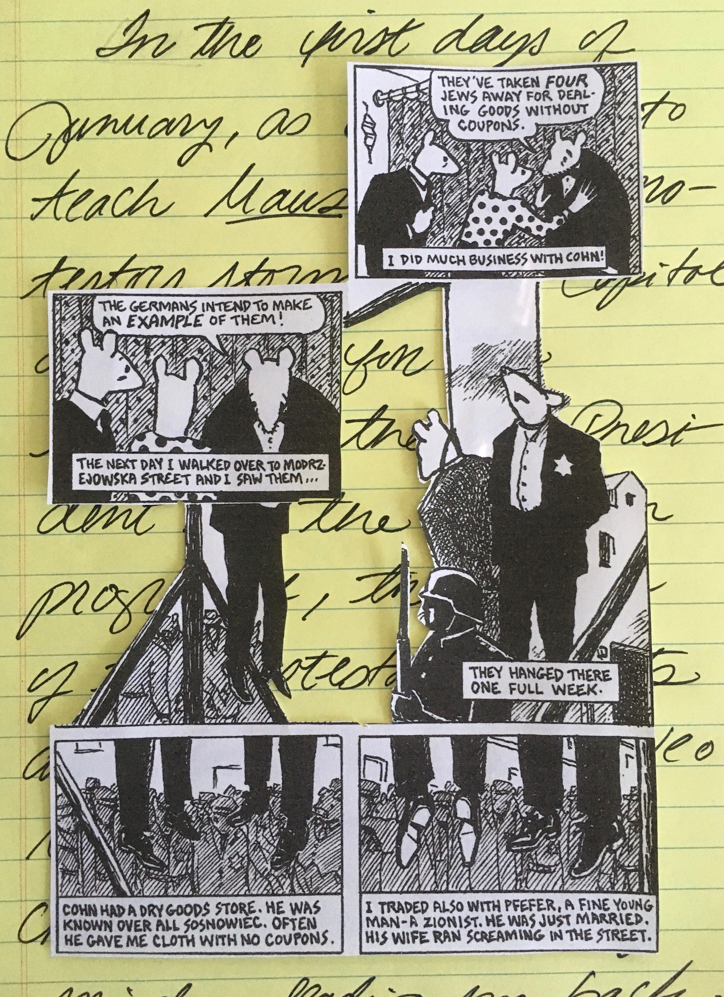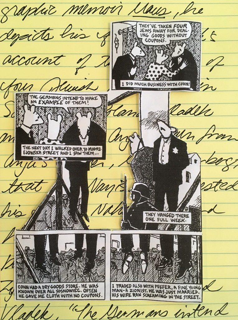 In his graphic memoir Maus, Art Spiegelman devotes a page to his father Vladek’s account of the hangings of four Jewish merchants in Sosnowiec, Poland. Vladek and his wife, Anja, learn from Anja’s father, Mr. Zylberberg, that the Nazis have arrested his friend Nahum Cohn and his son. With his head bowed in sorrow, Mr. Zylberberg says to Anja and Vladek, “The Germans intend to make an example of them!” (83). That image of Mr. Zylberberg speaking with Vladek and Anja overlies the larger panel that dominates the page, one that depicts the horror that Mr. Zylberberg anticipates: the murder of his friend Nahum Cohn, Cohn’s son, and two other Jewish merchants. That haunting panel and the smaller ones that frame it illustrate the complexity of Spiegelman’s seemingly simple composition. His rendering of the panels of the living in conjunction with the fragmented panels of the hanged merchants simultaneously conveys connection and separation: both the grieving survivors’ ties to the dead and the hanged men’s objectification at the hands of the Nazis.