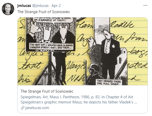 Spiegelman’s transformation of the Nazi propaganda portrayals of Jews as rats remains an astounding achievement thirty-five years after the publication of the first volume of Maus. But seeing the hanged merchants in Modrzejowska Street in the midst of the George Floyd murder trial in Minneapolis and less than three months after the January 6 Capitol riot reminds readers that the panels of Spiegelman’s memoir have grown more prescient. The nooses evoke images of Officer Derek Chauvin’s knee on George Floyd’s neck, the January 6 chants to hang the Vice President, and a T-shirt glimpsed in the Capitol crowd, one with a Nazi eagle below the acronym “6MWE” (Six Million Wasn’t Enough), a reference to the numbers of Jews slaughtered in the Holocaust. Our heads are bowed in sorrow with Mr. Zylberberg’s. The strange fruit of our past, both distant and recent, should seem far stranger.
